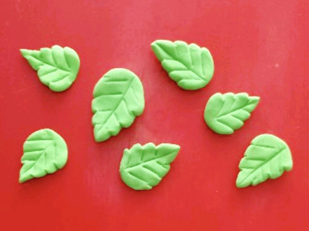 Крок 6. Ліпимо листочки. За допомогою стеки по кінцях робимо форму листочків та продавлюємо прожилки (7 шт. буде достатньо).
