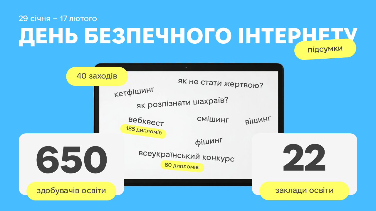 Один день, що розтягнувся майже на два тижні. Саме стільки тривали онлайн-активності до Дня безпечного інтернету в рамках інформаційно-просвітницької кампанії з медіаграмотності за ініціативи керівника гуртка «Екологія у форматі ІКТ» Романа Муржака. Відповідно, маємо неперевершені результати: 40 онлайн-заходів, до яких долучились 650 здобувачів освіти з 22 освітніх закладів міста!