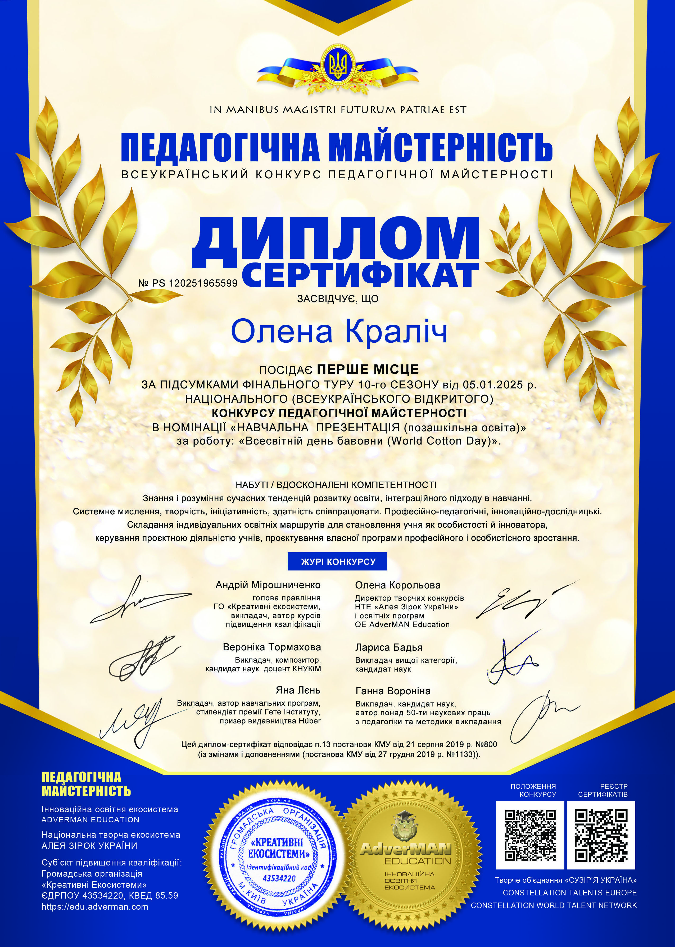Маємо чергову нагоду порадіти за досягнення наших колег! Творчий тандем заступниці директора з навчально-виховної роботи Ганни Наумович та керівниці зразкового художнього колективу театру мод "Class" Олени Краліч отримав перемогу на Національному (Всеукраїнському відкритому) конкурсі педагогічної майстерності. Їх робота "Всесвітній день бавовни" посіла І місце в номінації "Навчальна презентація (позашкільна освіта)".