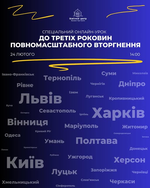 Освітній центр Верховної Ради України анонсує спеціальний масштабний онлайн-урок до третіх роковин повномасштабного вторгнення рф на територію України.
