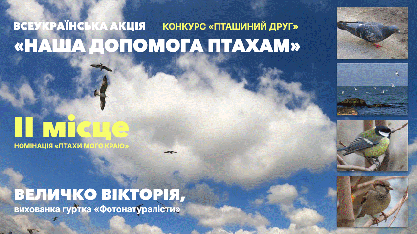 Просто «летимо на крилах» для привітань Вікторії Величко, вихованки гуртка «Фотонатуралісти» (керівниця – Наталя Величко), із перемогою у конкурсі «Пташиний друг» Всеукраїнської акції «Наша допомога птахам». У номінації «Птахи мого краю» презентація Вікторії посіла ІІ місце.
