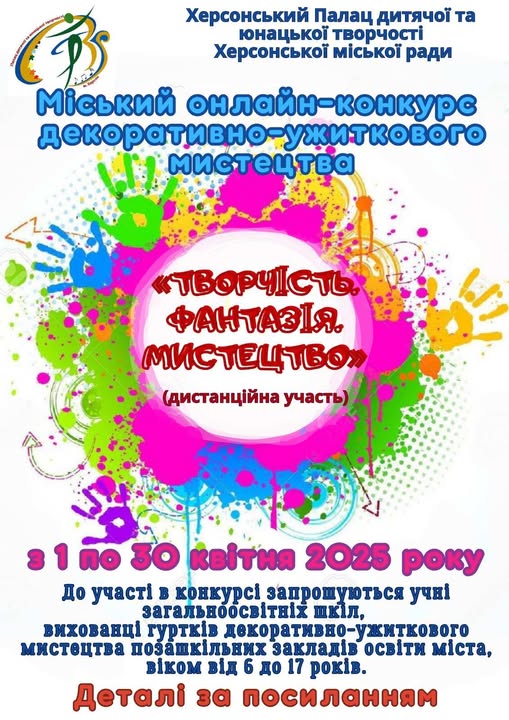 Херсонський Палац дитячої та юнацької творчості запрошує прийняти участь в міському онлайн-конкурсі декоративно-ужиткового та прикладного мистецтва «Творчість. Фантазія. Мистецтво.»