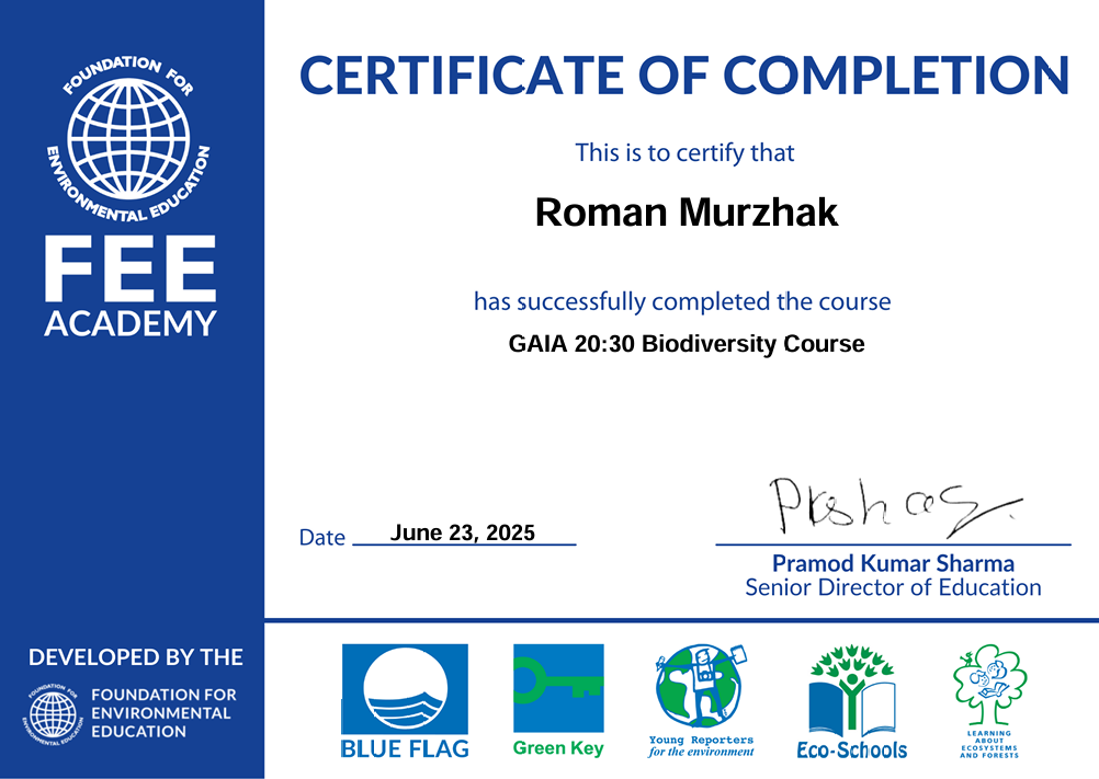 Такої позиції дотримується наш керівник гуртків «Екологія у форматі ІКТ» Роман Муржак. Доказом цьому є ще один отриманий сертифікат міжнародного зразка за проходження онлайн-курсу «Вступ до GAIA 20:30. Курс біорізноманіття» від Фонду екологічної освіти (FEE ACADEMI).