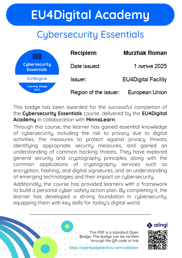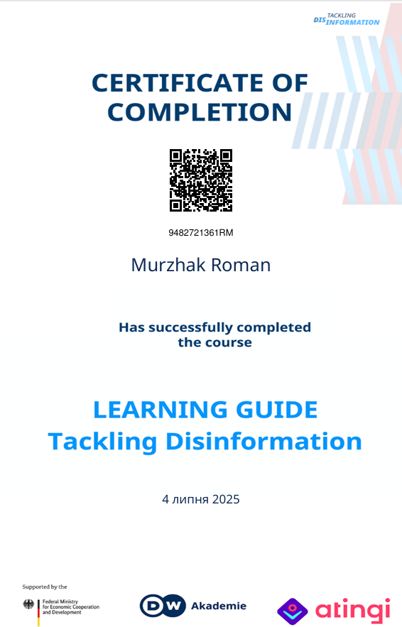 Успішне завершення навчання від європейських академій: EU4Digital та DW Akademie! Керівник гуртків «Екологія у форматі ІКТ» Роман Муржак вдосконалив свої цифрові навички в рамках європейської ініціативи EU4Digital та фонду нових підходів (SNV). Його кваліфікацію підтверджено європейськими сертифікатами, що діють безстроково на всій території ЄС.