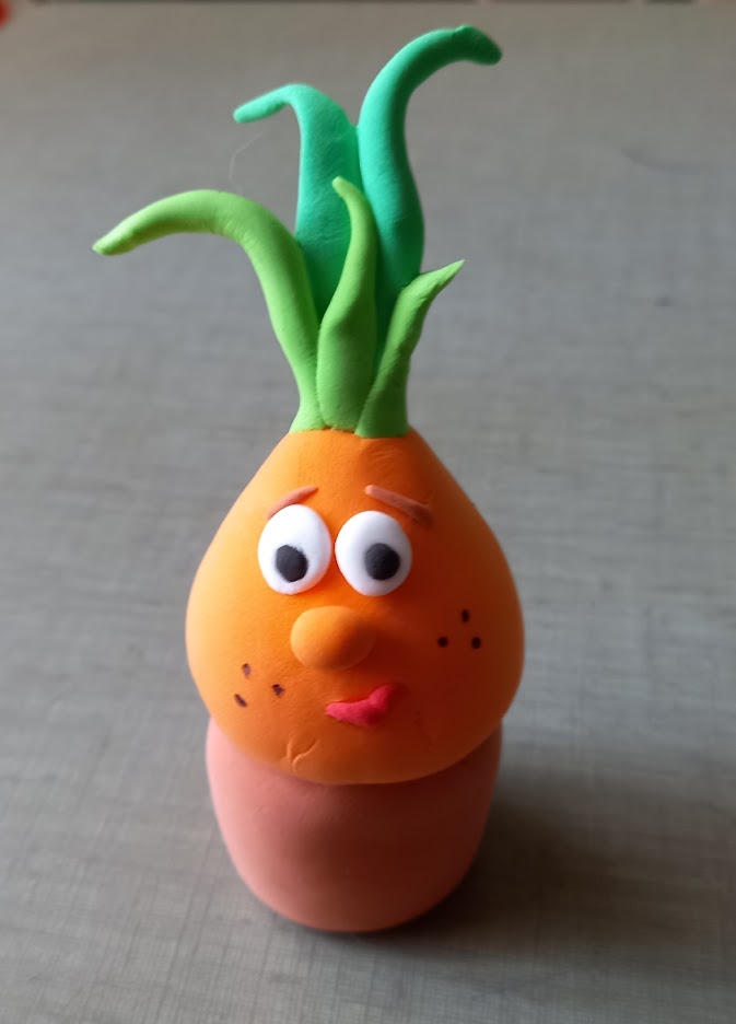 Для цибулинки з помаранчевого пластиліну скатуємо кульку, яку зверху витягуємо. Ліпимо на цибулинці носик, очі, ротик.