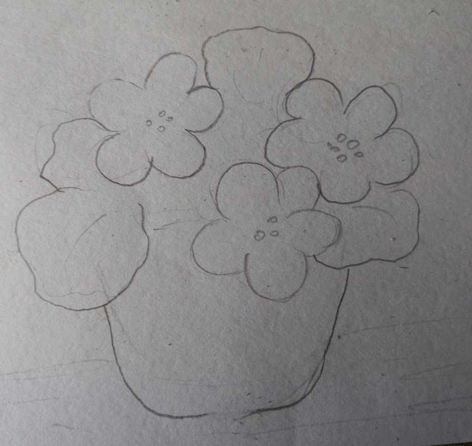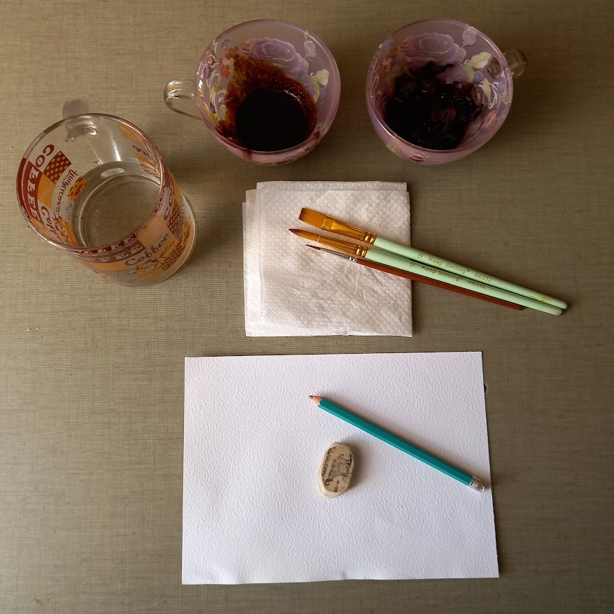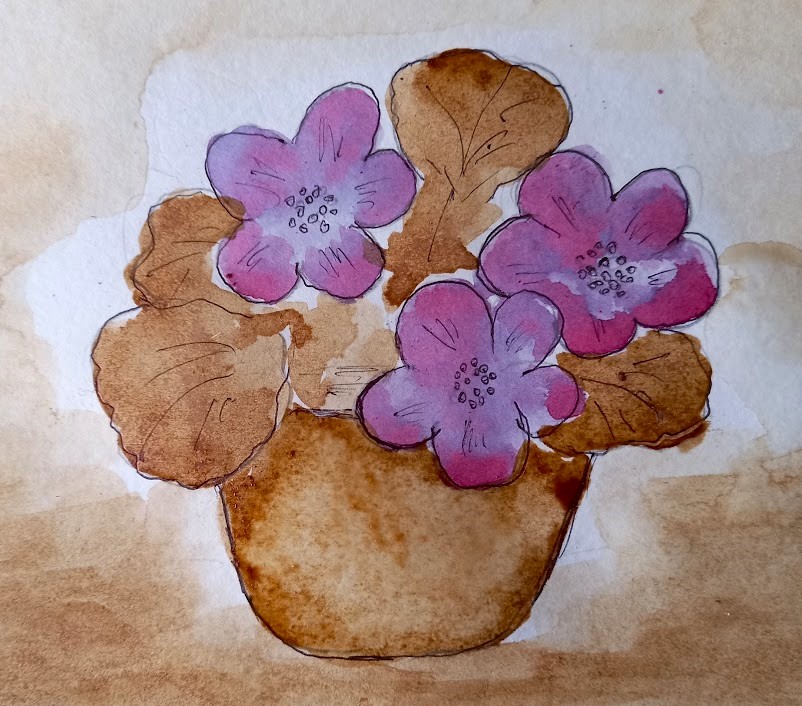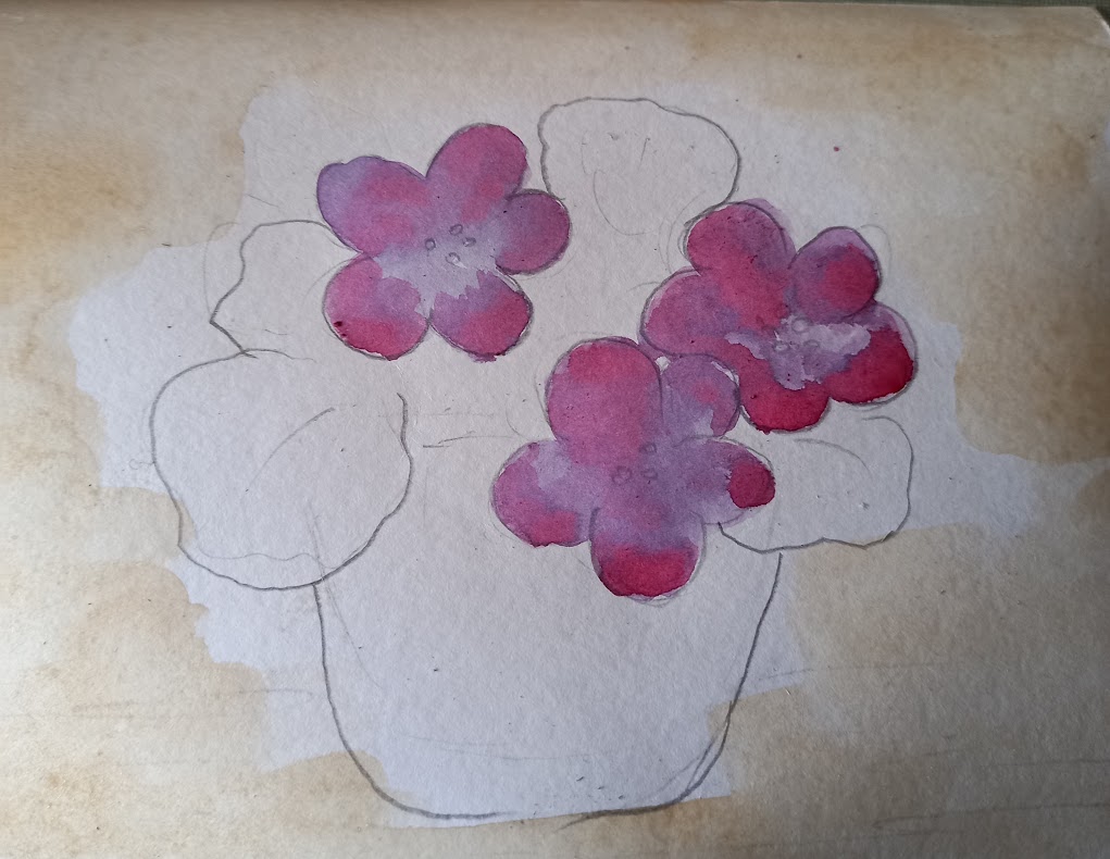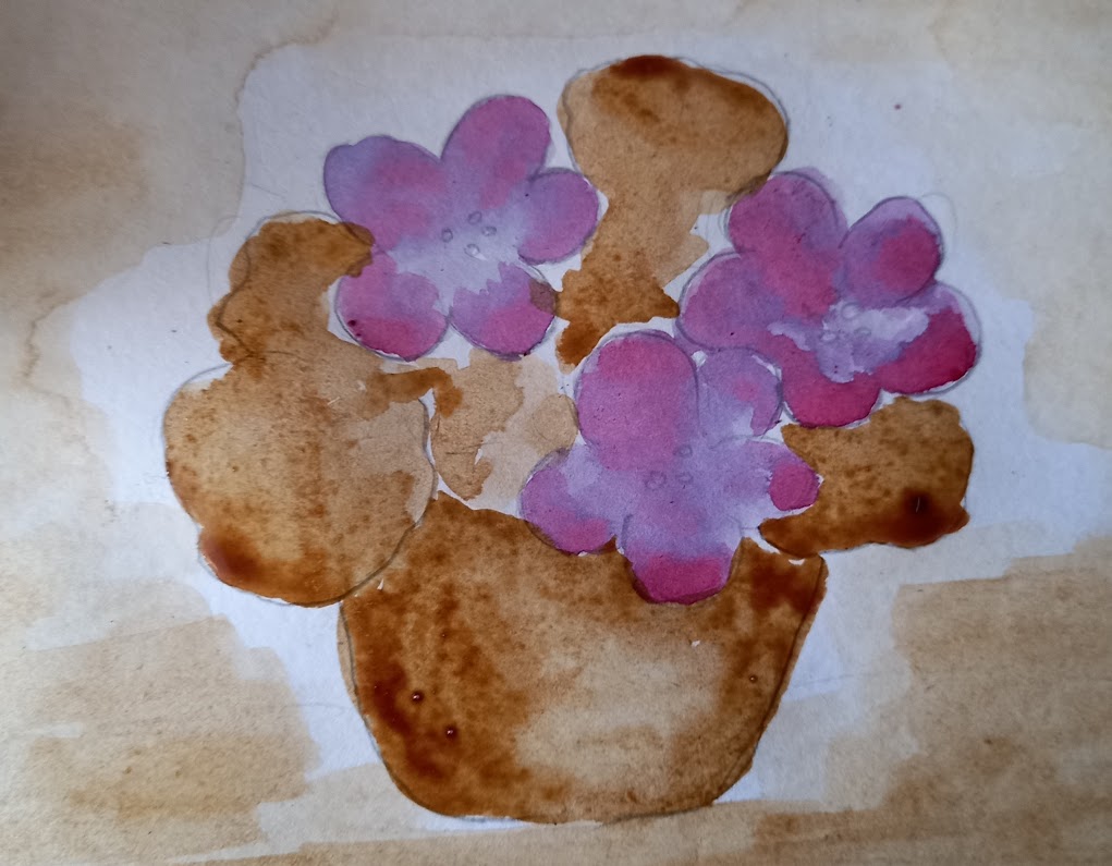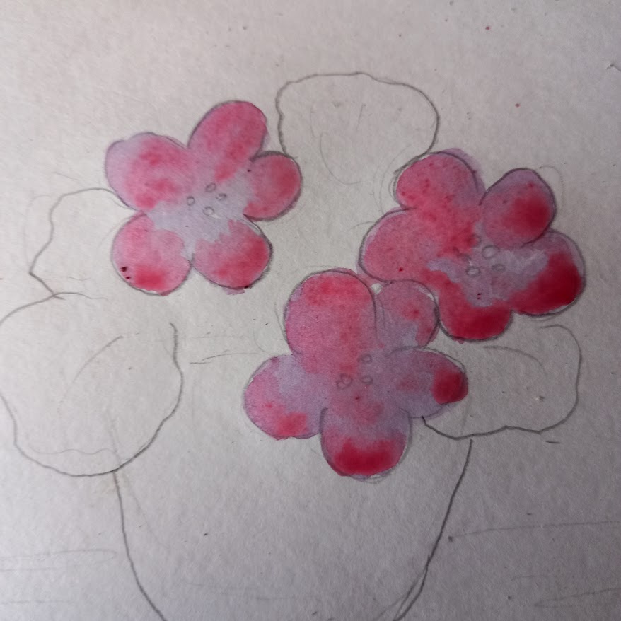 Крок 2. Покриваємо квіти світлим розчином фарби чаю. Світлий розчин робиться розмивкою на папері або на палітрі. Відтіняємо пелюстки темнішим кольором.