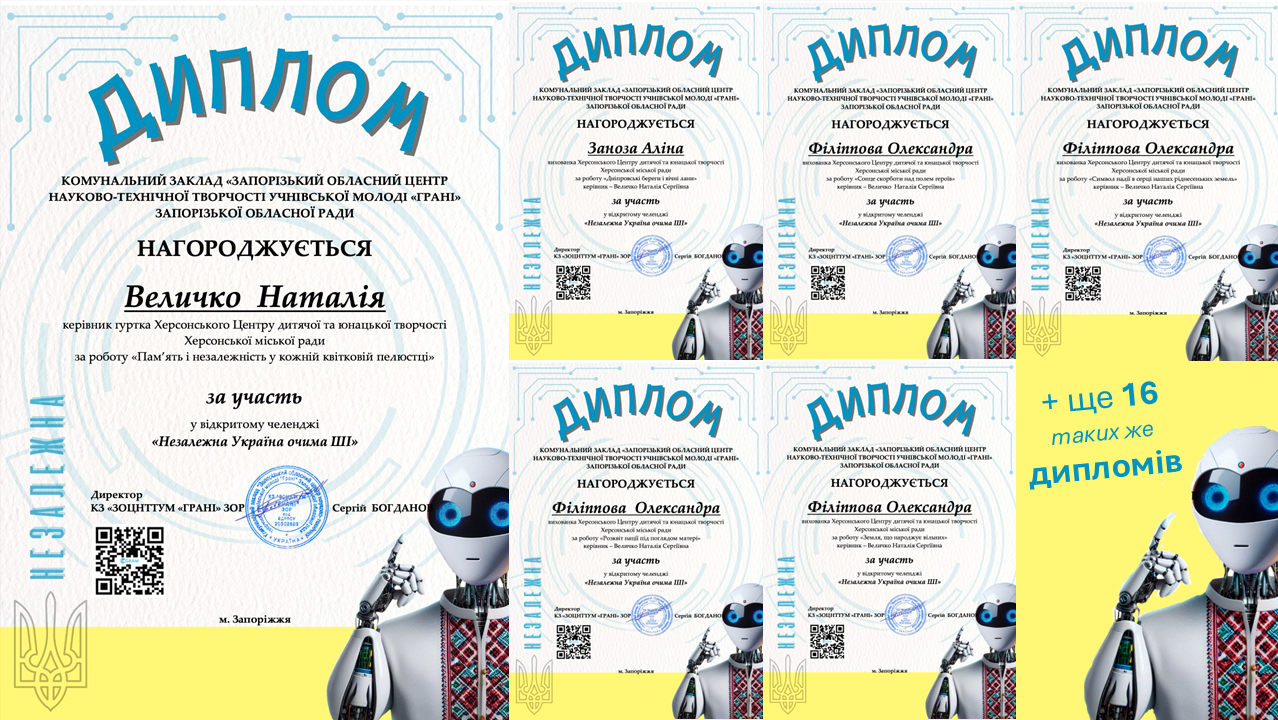 22 дипломи отримали вихованки гуртків "Фотонатуралісти" разом із керівницею Наталією Величко за участь у відкритому челенджі "Незалежна Україна очима ШІ". Роботи дівчат можна переглянути у дописі http://surl.li/alrihz