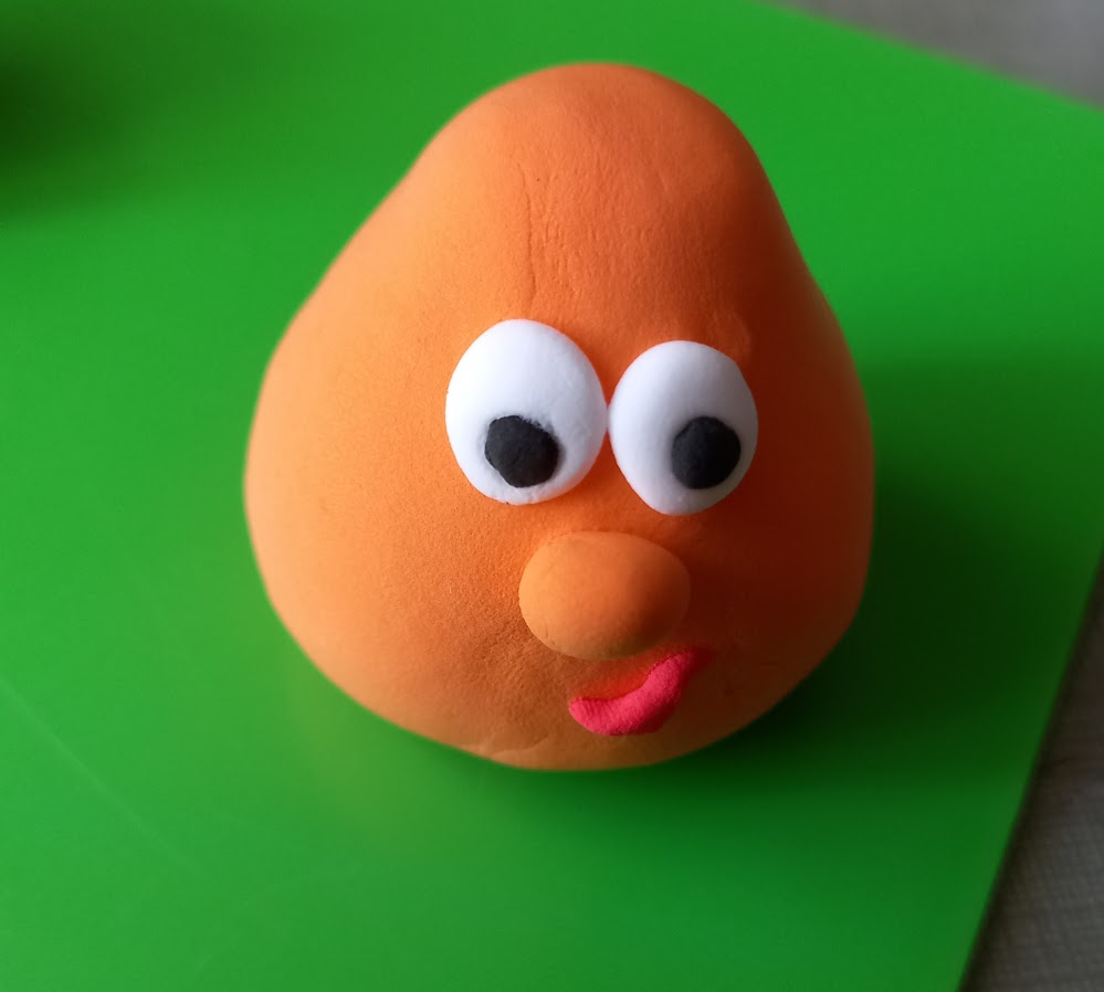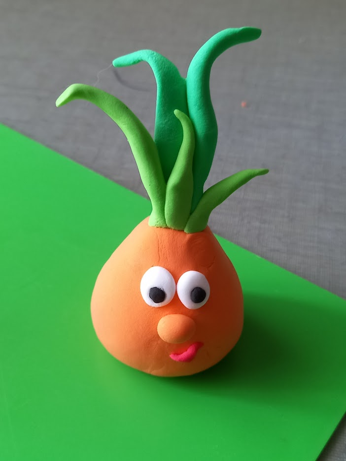 Для цибулинки з помаранчевого пластиліну скатуємо кульку, яку зверху витягуємо. Ліпимо на цибулинці носик, очі, ротик.