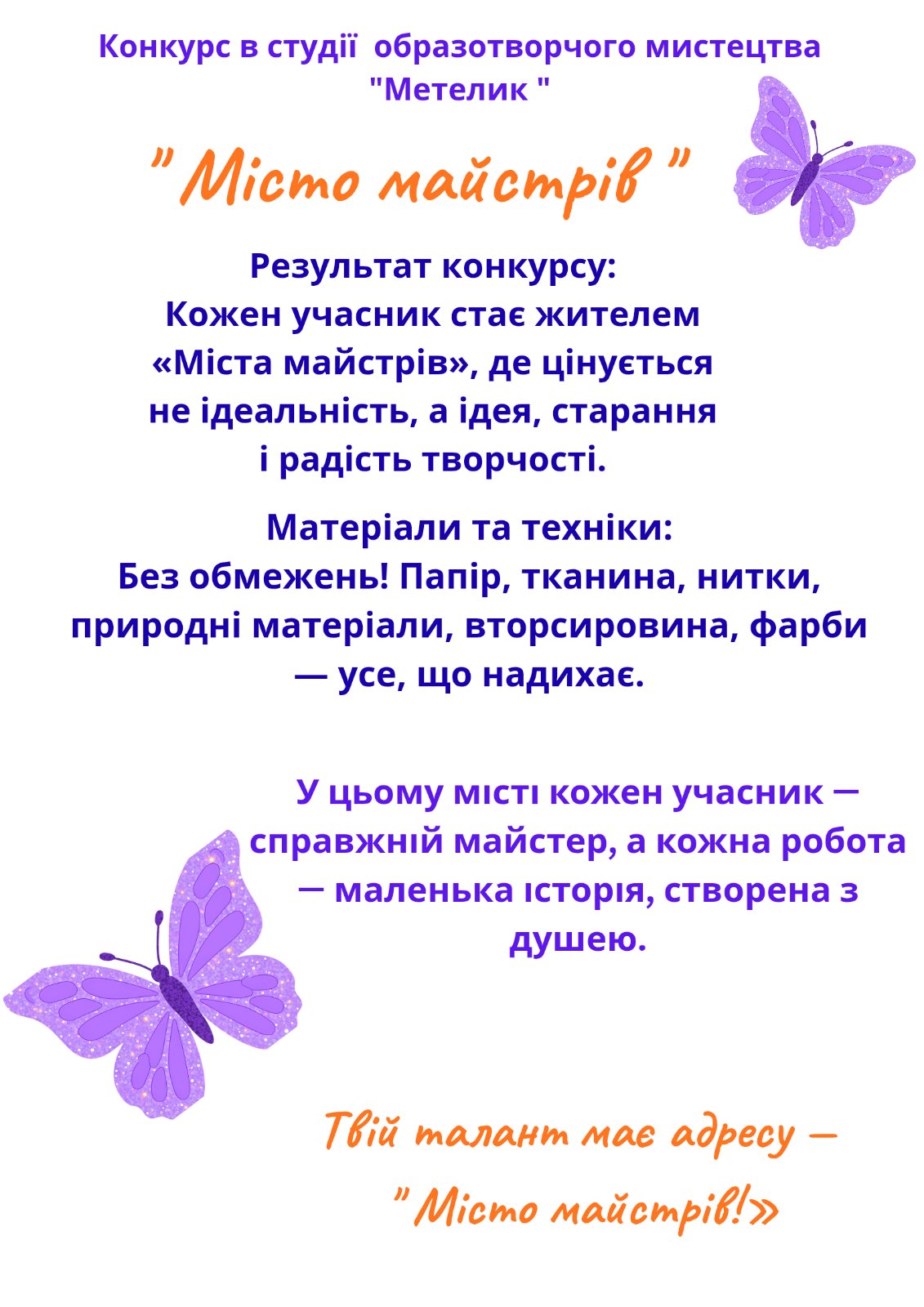 Місто майстрів! Саме з такою назвою завершився творчий конкурс у зразковому художньому колективі студії образотворчого мистецтва "Метелик" (керівниці: Олеся Фахрадова, Віта Лисенко). І переможців виявилося чимало! Як же прекрасно бути жителем такого міста! А поки ви ще не встигли отримати там творчу прописку — запрошуємо на екскурсію нашими креативними вуличками :)