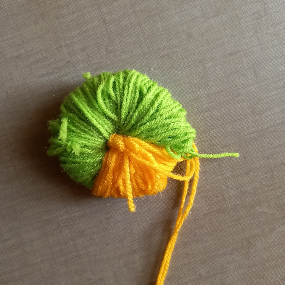 Крок 3. Створюємо помпон. З'єднуємо 2 бублика та обмотуємо нитками з двох кольорів (чим більше — тим пухнастіше).