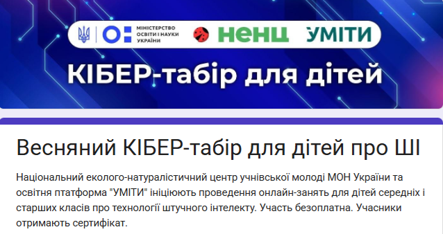 Детальніше: лист НЕНЦ від 04.03.2026 № 83 "Про проведення весняної сесії КІБЕР-табору"
