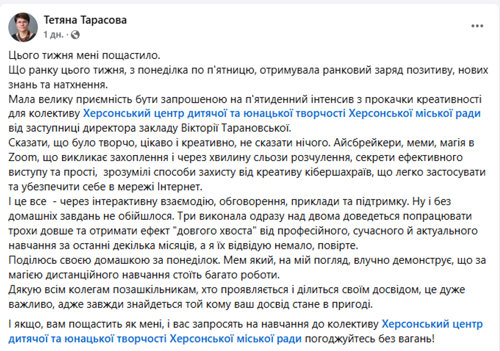 Вдруге! Провели інтенсив 2.0 «Дистанційка: креативне перезавантаження». Цього разу ми сфокусувалися на креативності, ефективності та безпеці. Вийшло потужне інформаційне комбо! Кожен учасник узяв те, за чим прийшов :) І не просто взяв, а вже активно впроваджує в освітній процес та дбає про особисту безпеку в цифровому просторі.