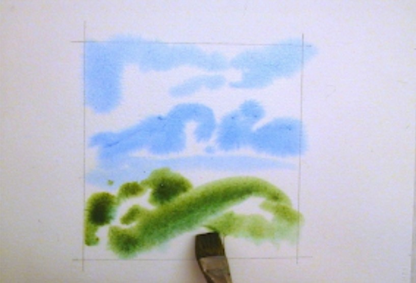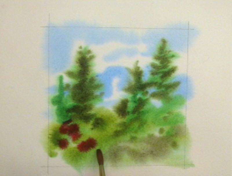 Крок 5. Тепер приступимо до трави на першому плані. Використовуючи зелений колір, зробимо кілька широких штрихів, залишивши місце для каміння. По мірі висихання паперу штрихи розпливаються все менше.