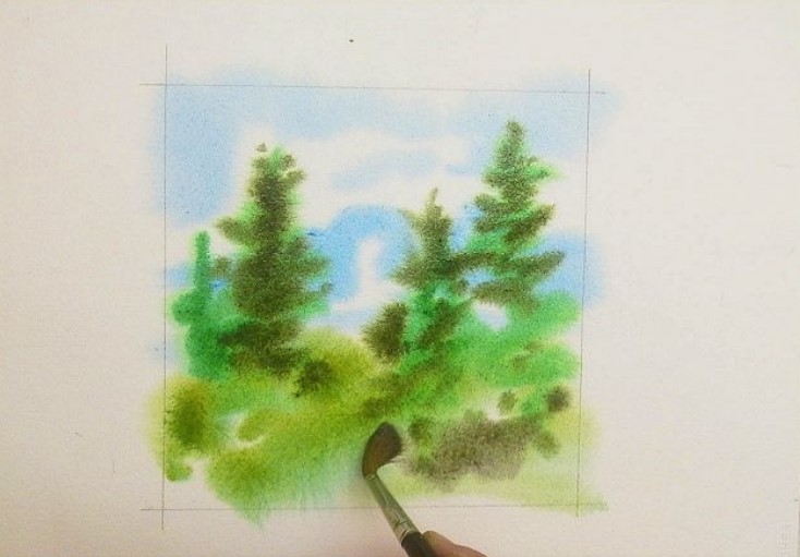 Крок 7. Додавши дерева, постараємося додати їм фактуру. Для цього використовуйте темніший відтінок зеленого, щоб розставити акценти.