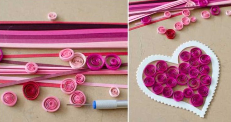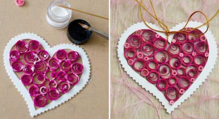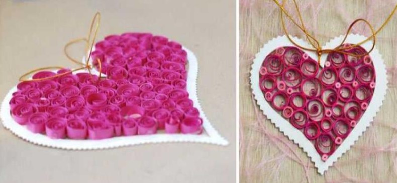 З паперових смужок за допомогою зубочисток скрутіть спіральки. Вони можуть бути різного розміру та кольору. Готові спіральки укладайте всередину картонного серця-основи та скріплюйте між собою ПВА.