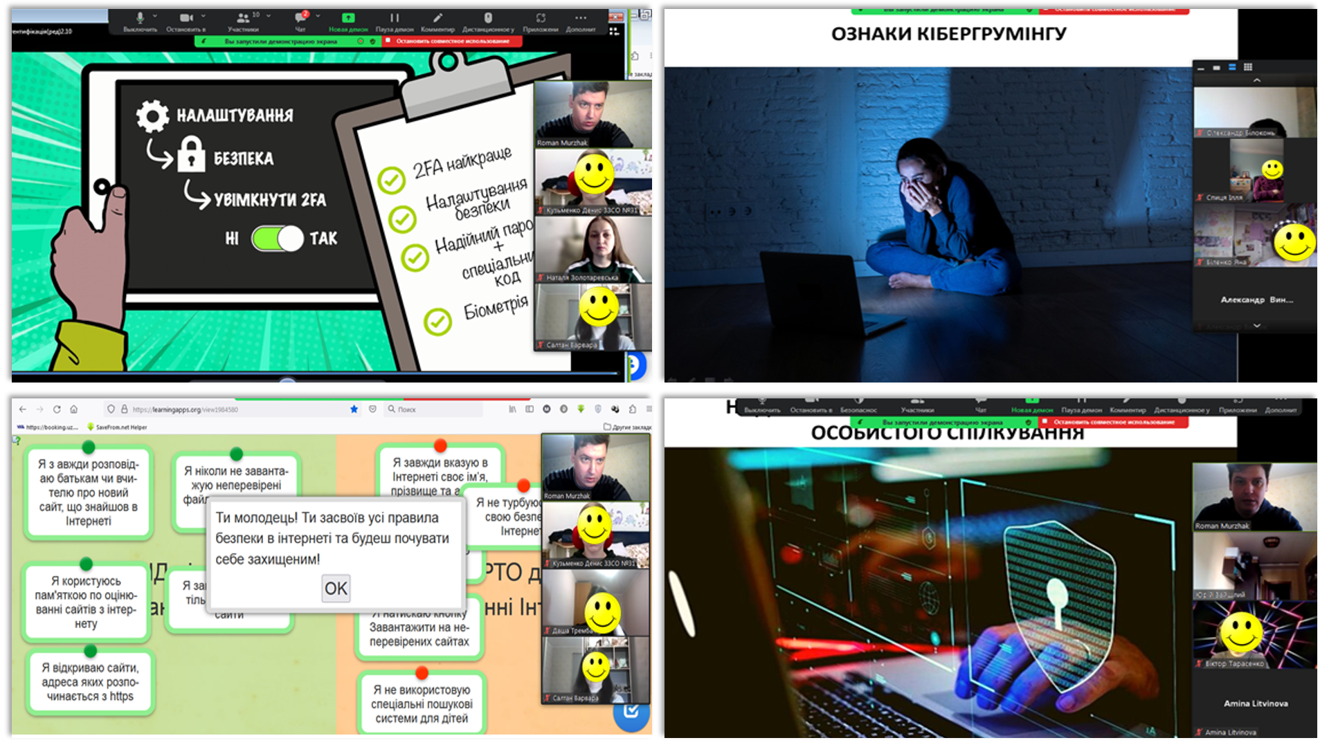 Обговорювались всі «тонкощі» соціальних мереж; знайомились з поняттям кібергрумінг, його ознаками та правилами боротьби з ним; проходили тест Кіберграм та переглядали освітні серіали на Дія. Освіта; вчились створювати надійні паролі.