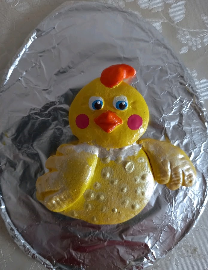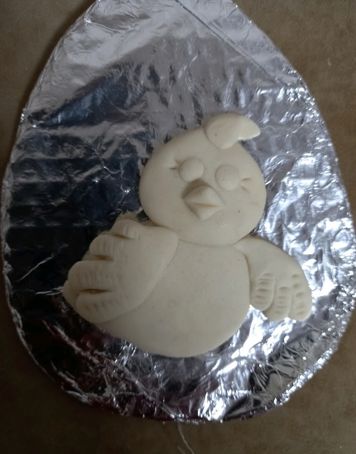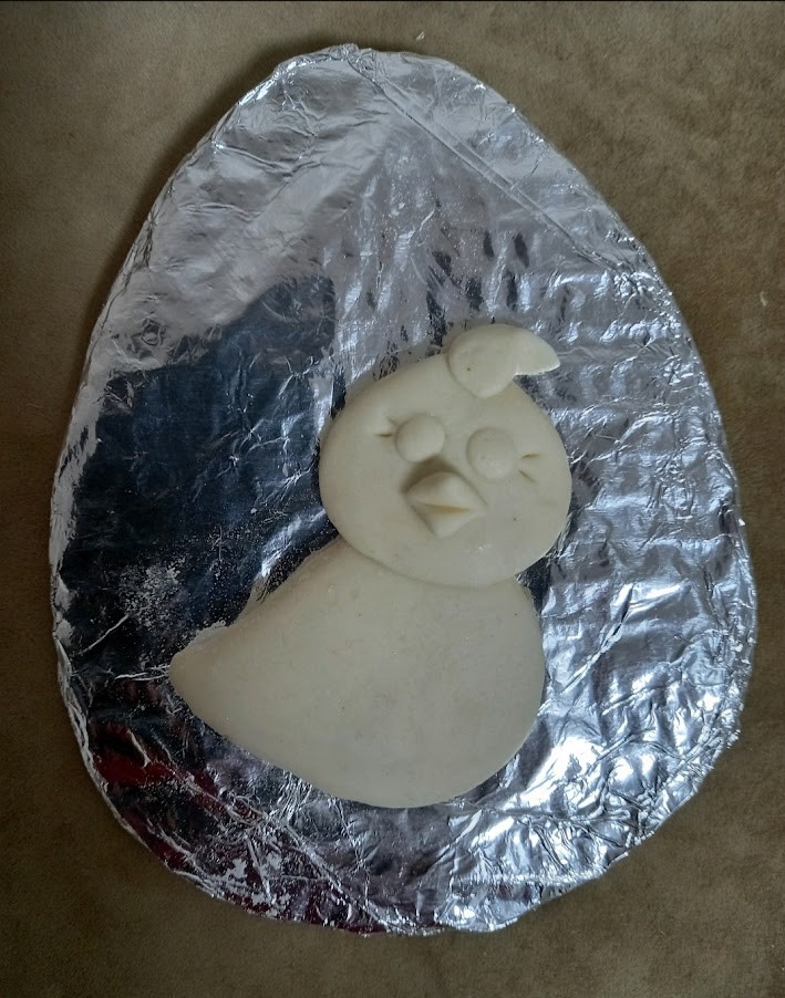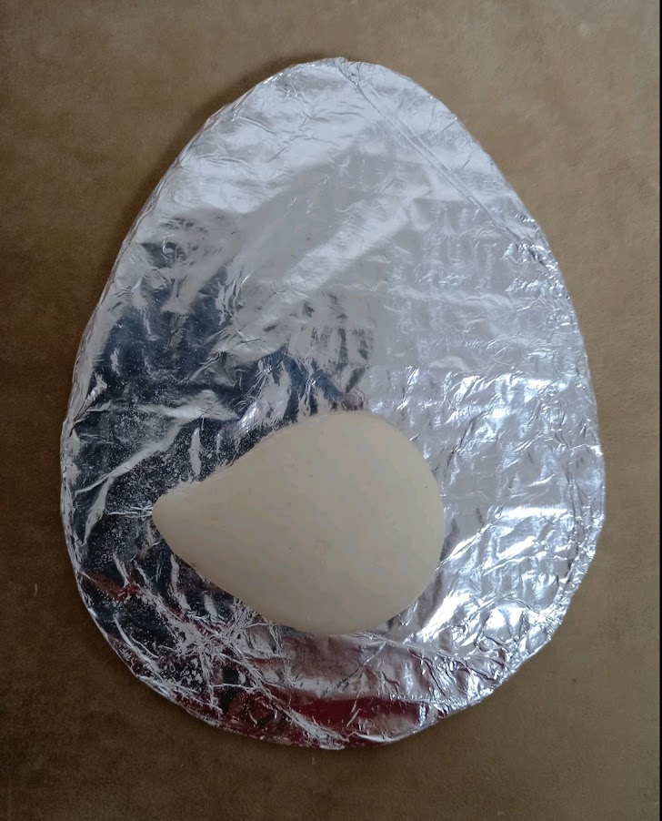 Покриваємо основу фольгою. На ній будемо ліпити курча. Спочатку ліпимо тіло у вигляді краплини.