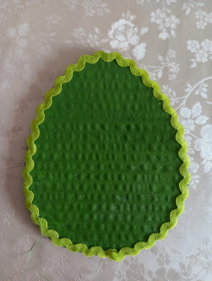Покриваємо зеленою фарбою основу. А коли підсохне, обклеюємо тесьмою край.