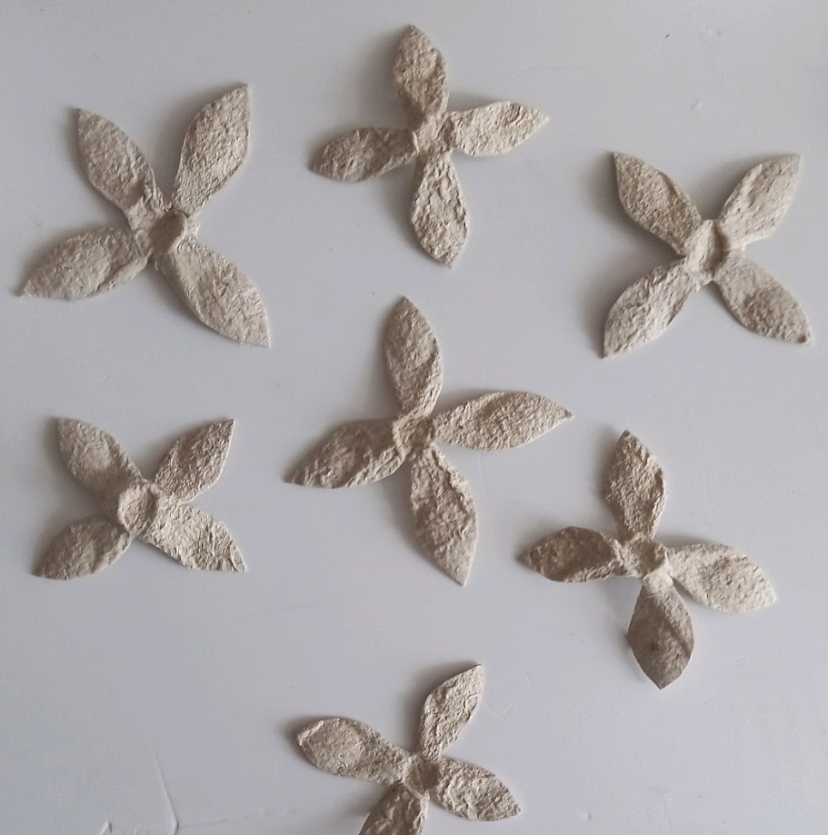 З непотрібних лотків для яєць вирізаємо деталі для квітів. Одна квітка складається із двох деталей.