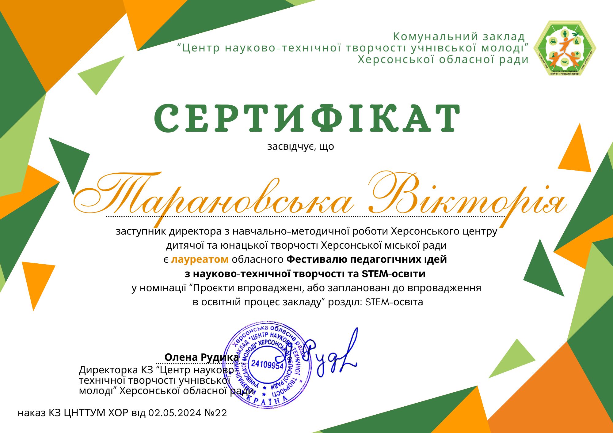 Творчий проєкт "STEM-hive" став лауреатом обласного фестивалю педагогійчних ідей з науково-технічної творчості та STEM-освіти у номінації "Проєкти впроваджені, або заплановані до впровадження в освітній процес закладу".