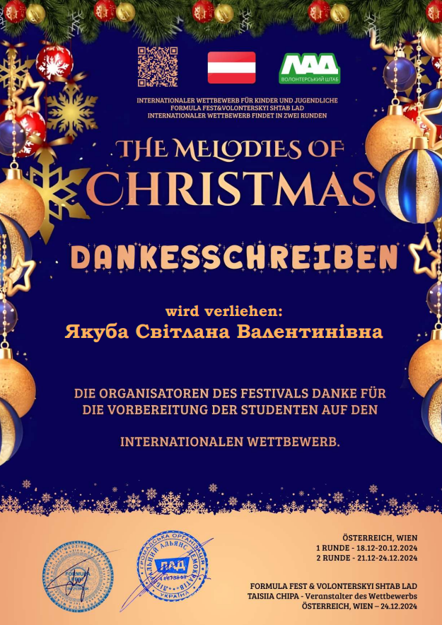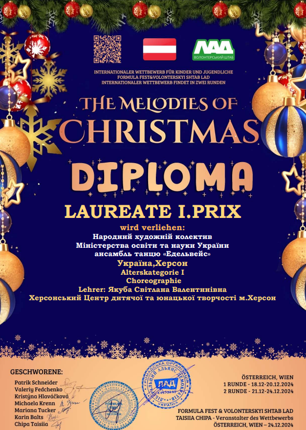 І місце на Міжнародному двотуровому конкурсі мистецтв "Мелодії Різдва" (м. Відень, Австрія) здобули вихованці народного художнього колективу системи Міністерства освіти і науки України ансамблю танцю "Едельвейс" (керівники: Світлана Якуба, Олег Якуба, Олена Набока). До диплому переможців — ще й подяка :)
