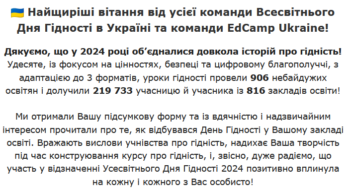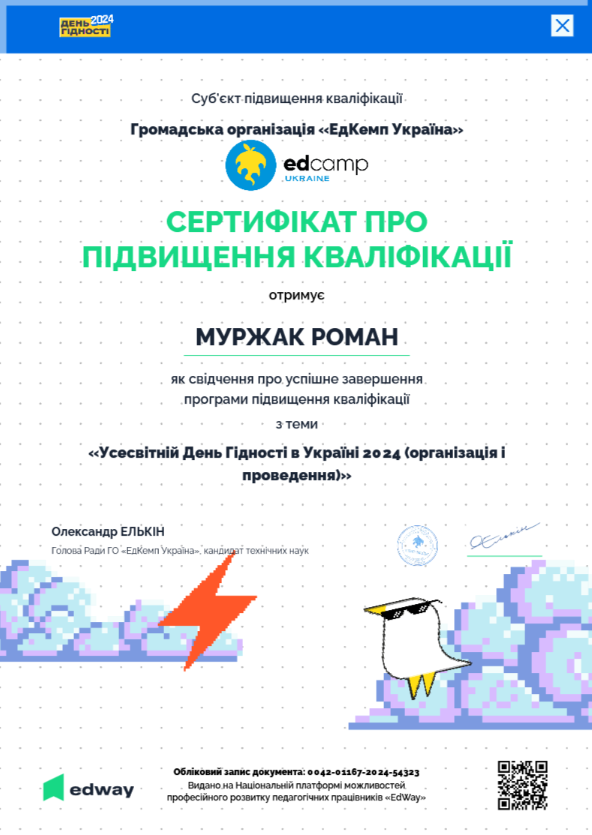Всі наші активності (допис: http://surl.li/ndrdla) з нагоди Всесвітнього Дня Гідності схвалено та засвідчено організаторами! Нагадаємо, що куратором усіх активностей у нашому Центру став керівник гуртка "Екологія у форматі ІКТ" Роман Муржак. За це йому велике "Дякуємо!" — від нас, а від організаторів — сертифікат :) До речі, його вихованці також отримають сертифікати учасників. Гідний результат!