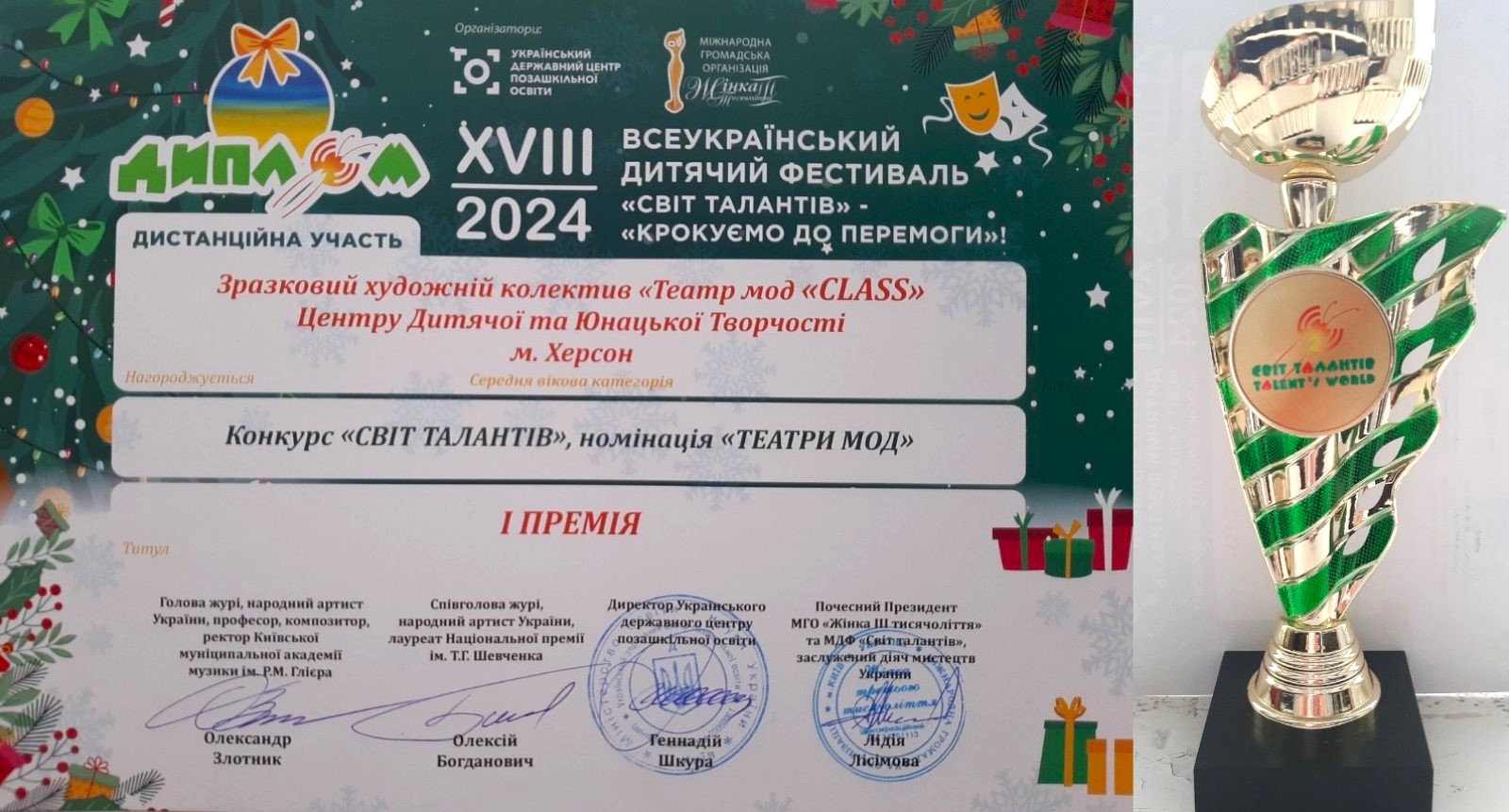 Патріотична колекція «За Україну!» зразкового художнього колективу системи Міністерства освіти і науки України театру мод «Class» (керівниця – Олена Краліч) Херсонського центру дитячої та юнацької творчості здобула І премію на XVIII Всеукраїнському дитячому фестивалі «Світ талантів-2024», що проходив під гаслом «Крокуємо до перемоги»!