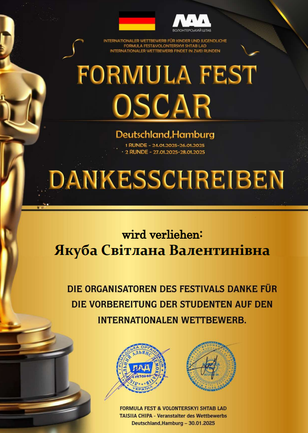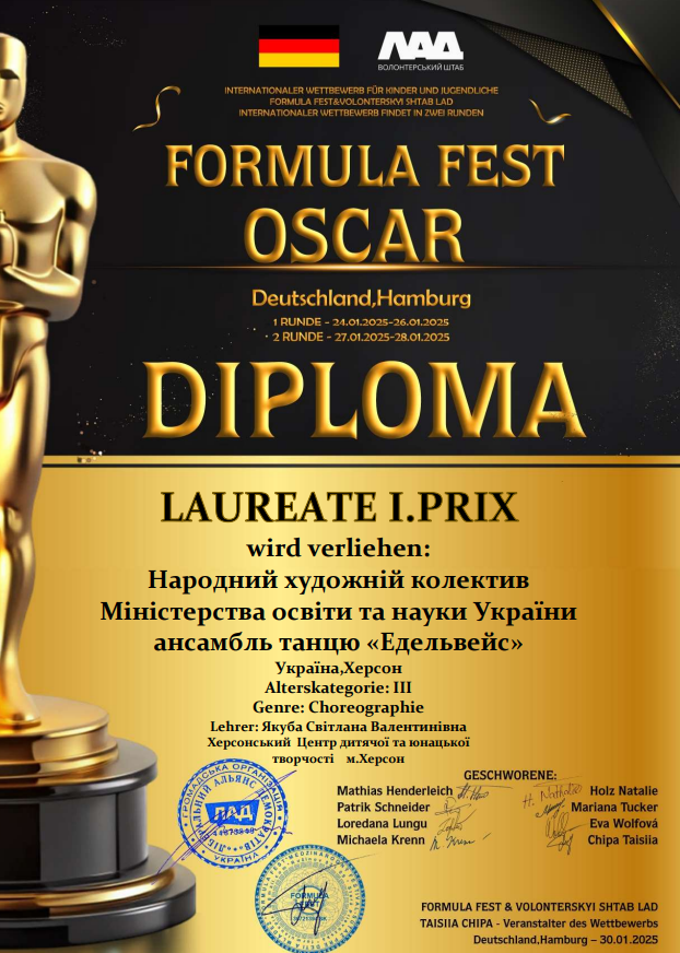 Маємо черговий чудовий привід порадіти за наших ювілярів, народний художній колектив ансамбль танцю "Едельвейс" (керівники: Світлана Якуба, Олег Якуба, Олена Набока) ! Колектив отримав Гран-прі на Міжнародному конкурсі дітей та юнацтва "Formula Fest Oscar", що дистанційно відбувся у м. Гамбург (Німеччина). Керівники — заслужену подяку :)