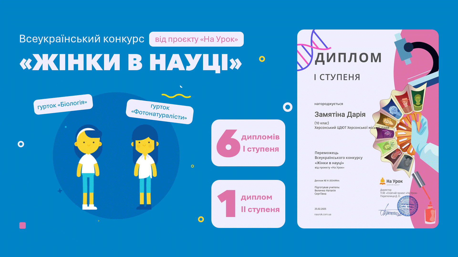 Символічно, що саме учора, у День української жінки, ми отримали ці результати. Увімкнулось шаблонне мислення й ми подумали, що серед переможців самі дівчата (скоро зрозумієте чому) :) А ні! П'ятеро дівчат та двоє хлопців — вихованці гуртків "Біологія" та "Фотонатуралісти" (керівниця — Наталя Величко) — стали переможцями Всеукраїнського конкурсу "Жінки в науці" від проєкту "На Урок". Тож вимикайте шаблонне і вмикайте креативне мислення :)