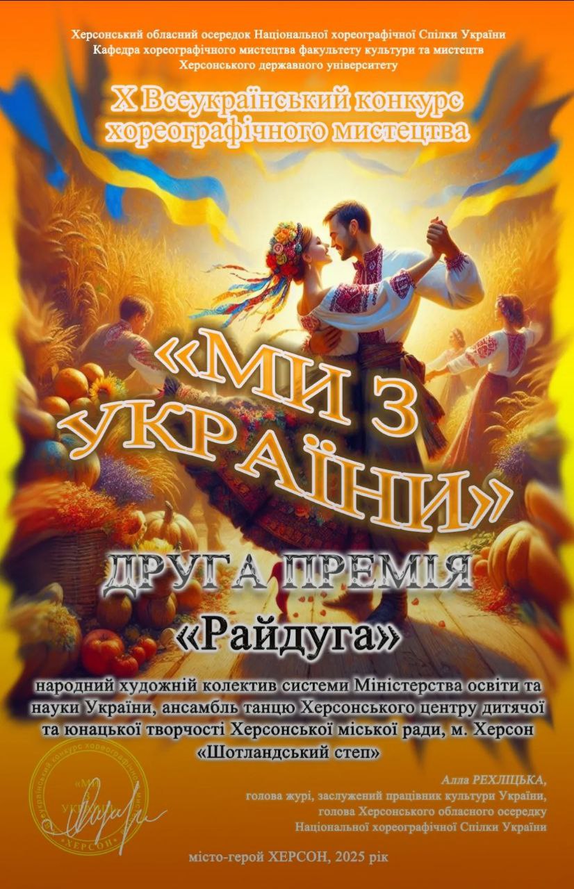 Тішимося результатом народного художнього колективу системи Міністерства освіти і науки України ансамблю танцю «Райдуга» (керівниця — Олена Добровольська). Вихованці здобули ІІ премію на Х Всеукраїнському конкурсі хореографічного мистецтва «Ми з України».
