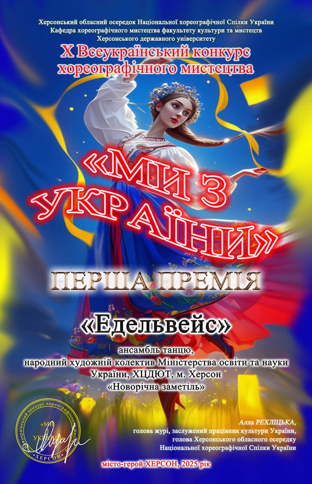 Радіємо здобуткам народного художнього колективу системи Міністерства освіти і науки України ансамблю танцю «Едельвейс» (керівники: Світлана Якуба, Олег Якуба, Олена Набока). Творчі номери "Новорічна заметіль" та "А журавлі летять" стали переможцями Х Всеукраїнського конкурсу хореографічного мистецтва «Ми з України» та Всеукраїнського мистецького конкурсу "Незламні жінки України".
