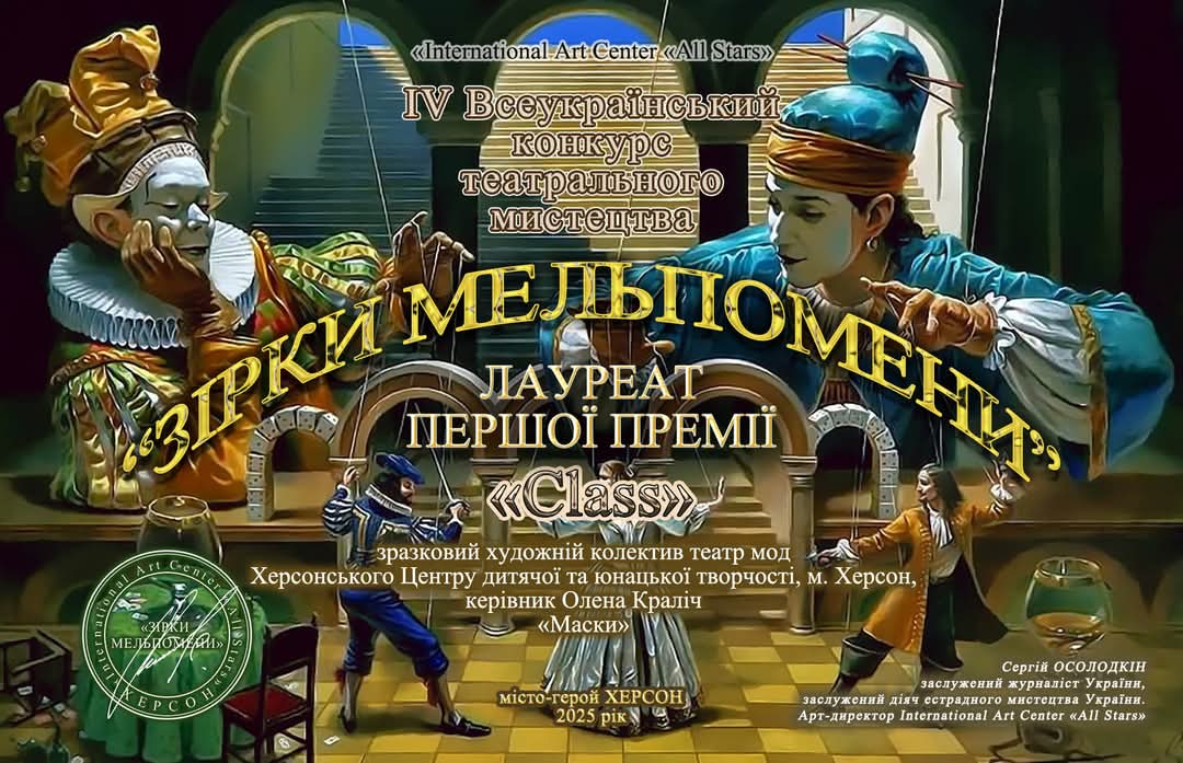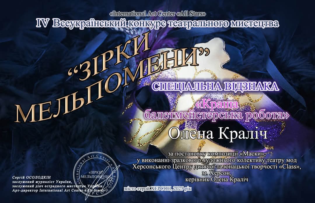 Цього разу на IV Всеукраїнському конкурсі театрального мистецтва «Зірки Мельпомени». Колекція «Маски» зразкового художнього колективу театру мод «Class» стала лауреатом першої премії. А керівниця колективу Олена Краліч отримала спеціальну відзнаку «Краща балетмейстерська робота».