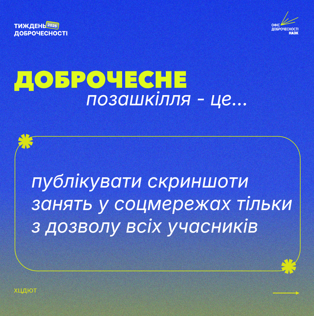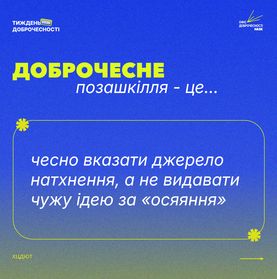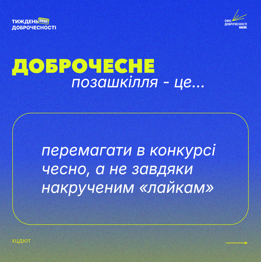 Позашкілля — це територія свободи. Але свобода неможлива без правил чесної гри! Рівні можливості, повага до авторства, чесна конкуренція — згодні? Створюймо середовище, в якому хочеться творити чесно!
