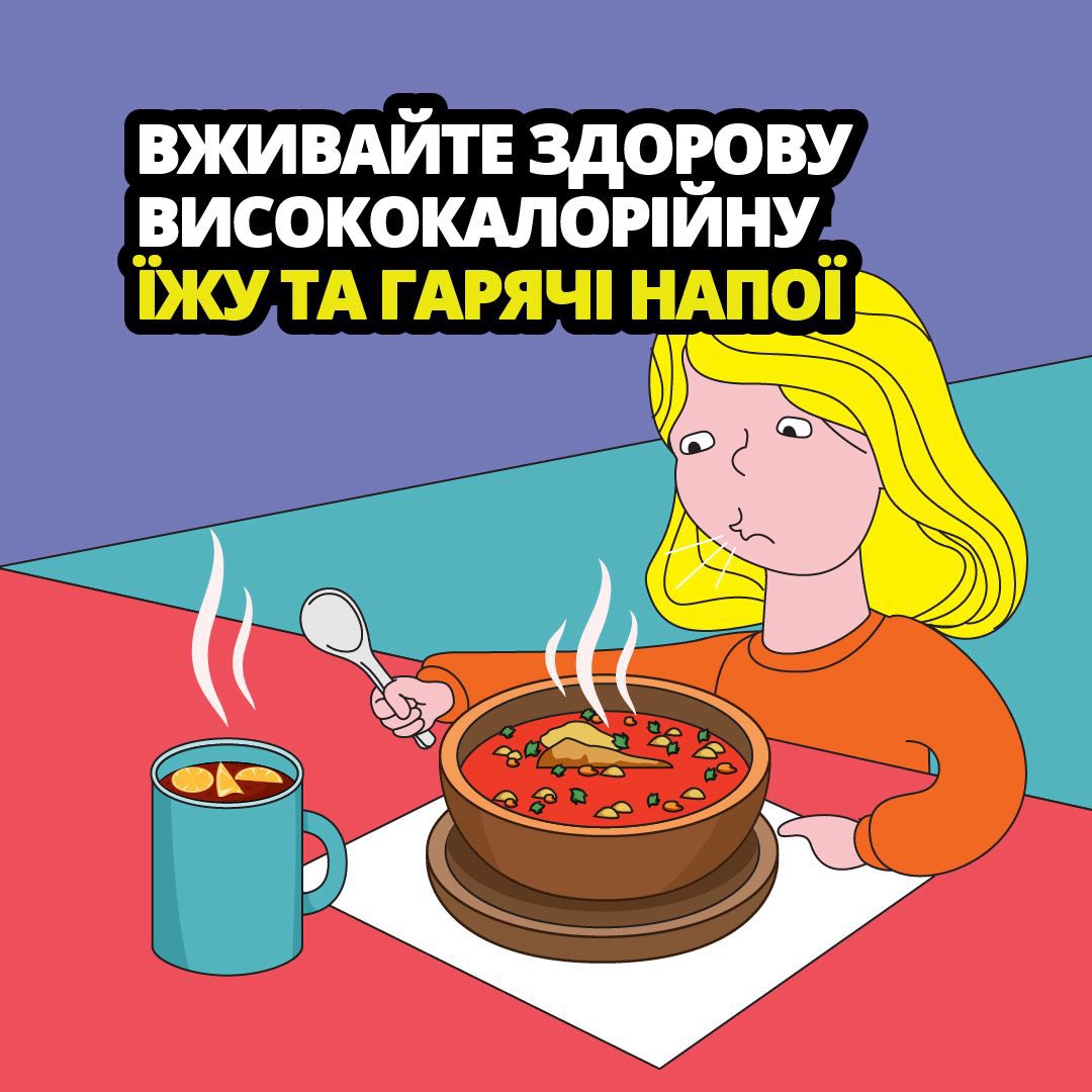 У холодну пору року організм потребує особливої підтримки, щоб зберігати тепло. Ось кілька простих лайфхаків від ДСНС України, які допоможуть уникнути переохолодження вам і вашим дітям: вживайте поживну, збалансовану їжу та пийте теплі напої; носіть термобілизну й дві пари шкарпеток (на тонші бавовняні — тепліші вовняні); одягайтеся багатошарово: термобілизна, фліс або кофта, зверху — теплий светр та верхній одяг.