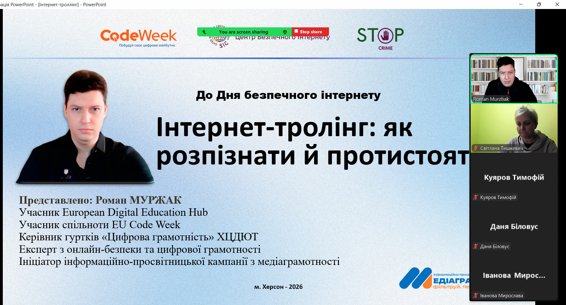 До Дня безпечного інтернету в нашому Центрі три тижні тривали активності з цифрової безпеки. Керівник гуртків «Цифрова грамотність» та учасник European Digital Education Hub Роман Муржак провів 37 зустрічей для 651 учасника (вихованців, здобувачів освіти міста, вихователів садочків).