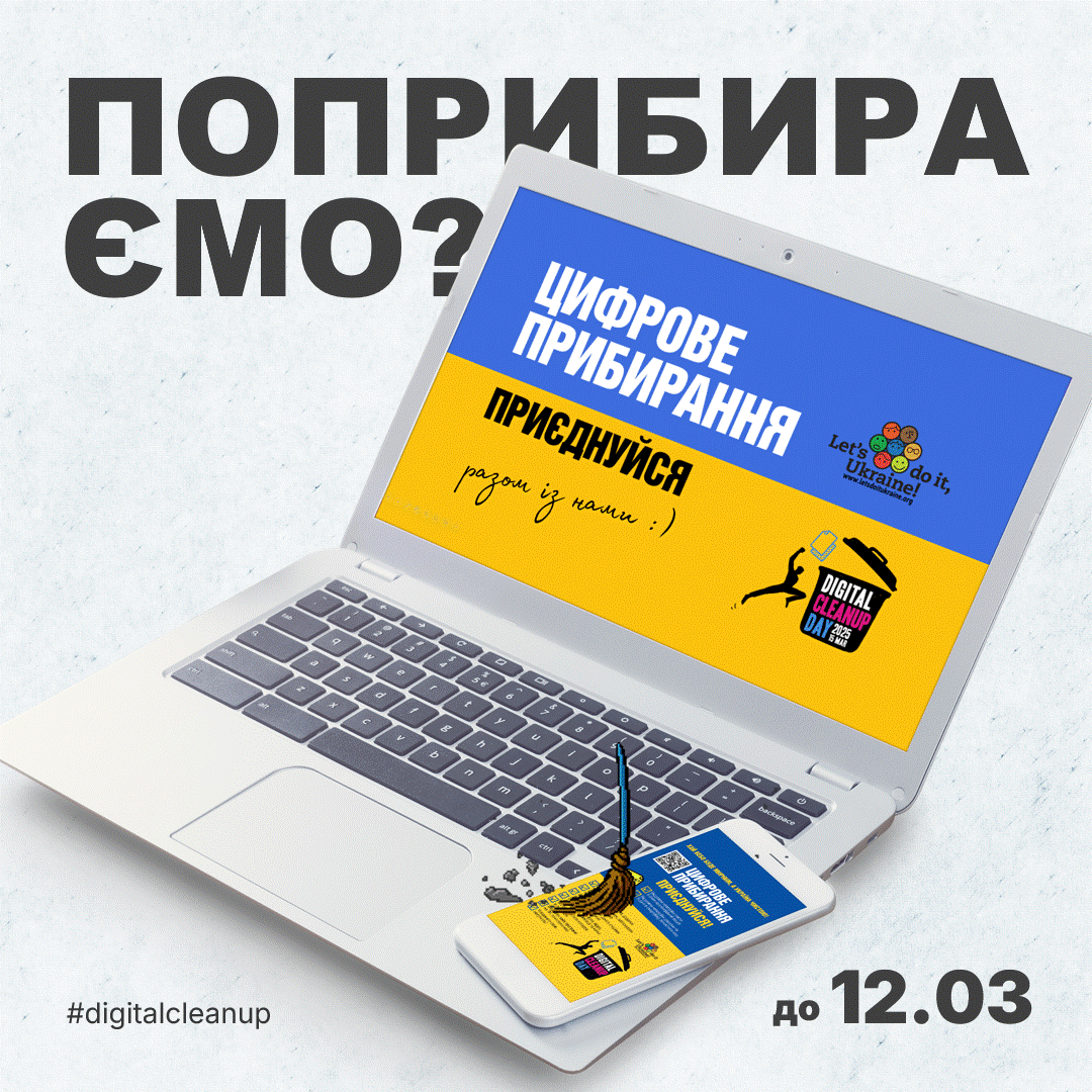 Запрошуємо долучитися до глобальної ініціативи цифрового прибирання «Digital Cleanup» та навести лад у власному цифровому просторі! Разом із найбільшим екологічним рухом України Let’s do it Ukraine зробімо наш цифровий світ чистішим, безпечнішим та більш екологічним. Це сучасний та безпечний онлайн-формат прибирання, у якому може взяти участь кожен!