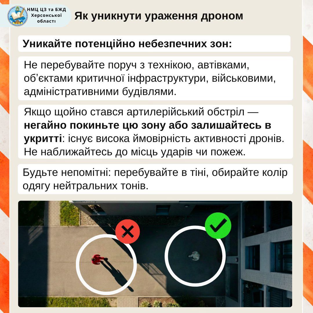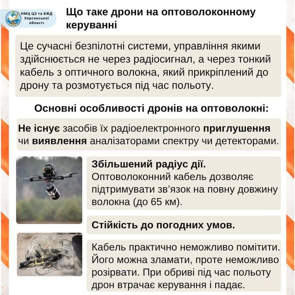 На Херсонщині значно зросла інтенсивність використання безпілотників, особливо нового типу — FPV-дронів на оптоволокні. Головна небезпека цих апаратів у тому, що вони стійкі до засобів РЕБ, а також їх неможливо виявити детекторами, оскільки ці БпЛА керуються через фізичний кабель, а не радіосигнал. Тому знання базових правил безпеки під час ворожого дронового терору є вкрай важливими. В інфографіці детально розібрано, як діяти в різних ситуаціях, аби мінімізувати ризики для життя. Інфографіку розробив Навчально-методичний Центр ЦЗ та БЖД Херсонської області.