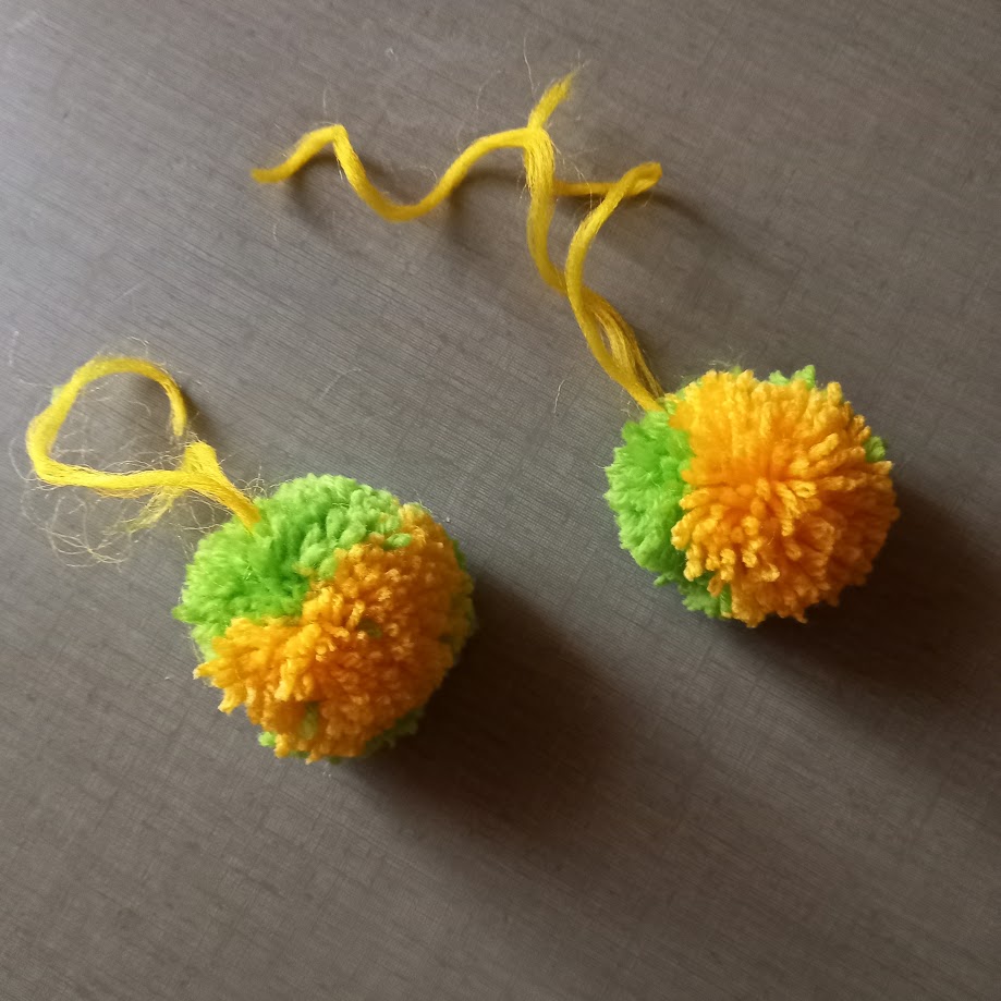 Крок 3. Створюємо помпон. З'єднуємо 2 бублика та обмотуємо нитками з двох кольорів (чим більше — тим пухнастіше).