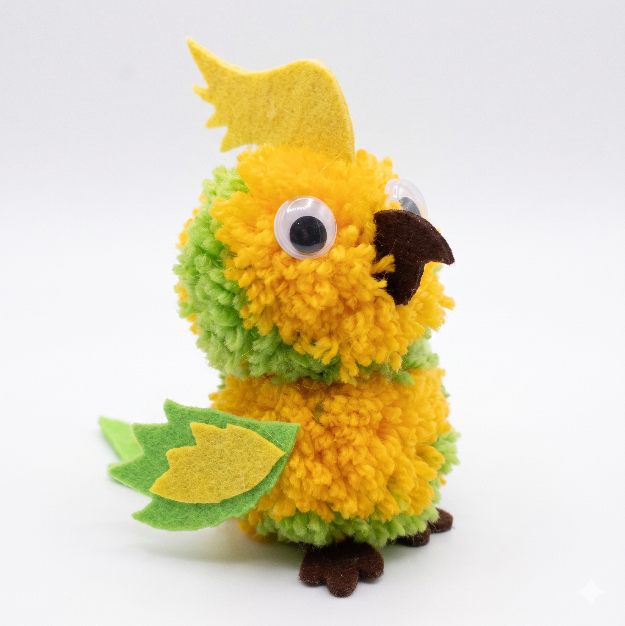 Крок 5. З’єднайте між собою пампони. Підрівняйте ножицями форму. Тіло папужки готове!