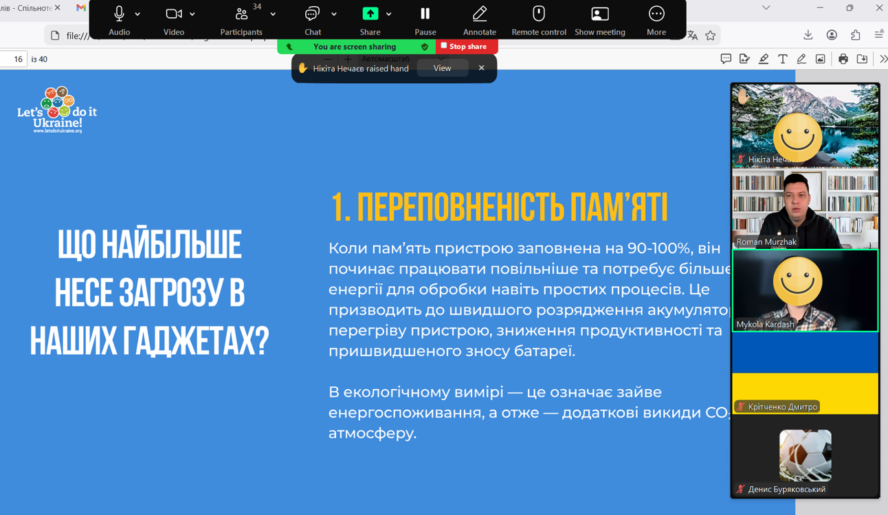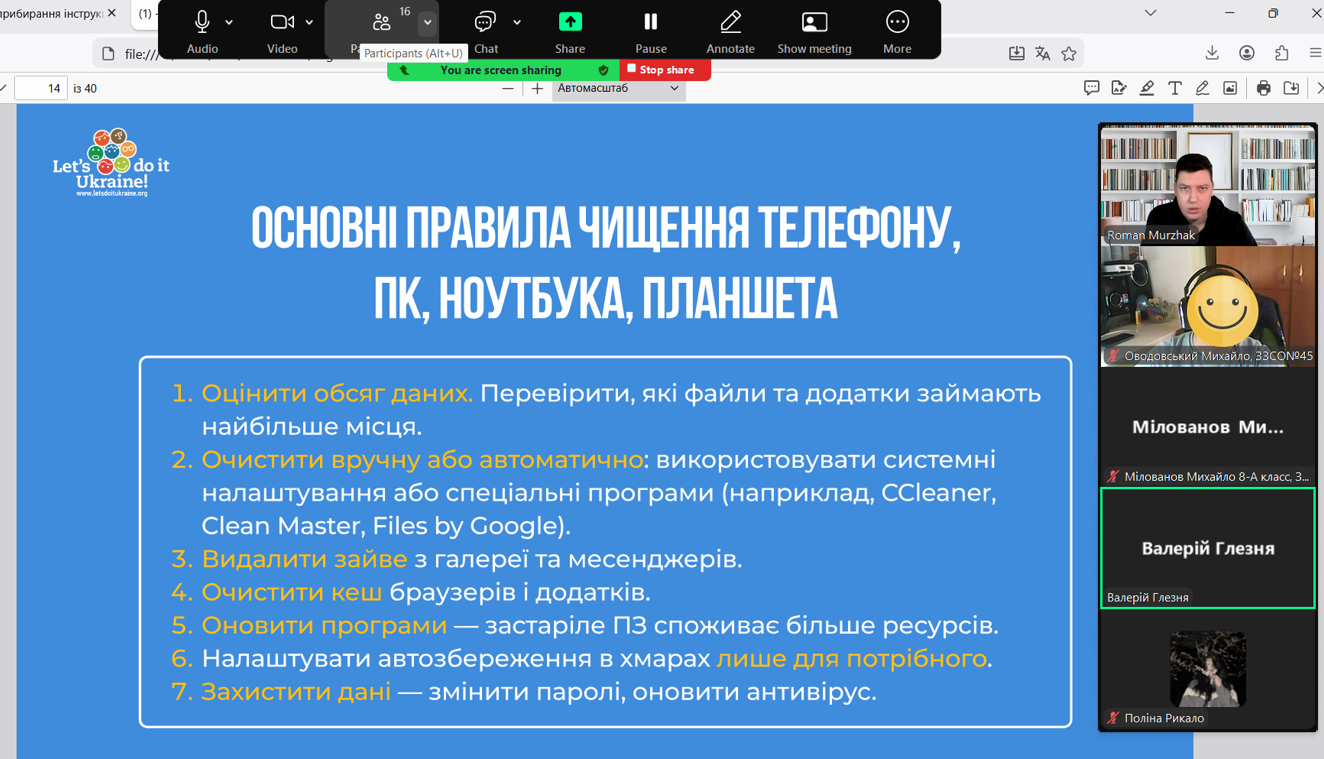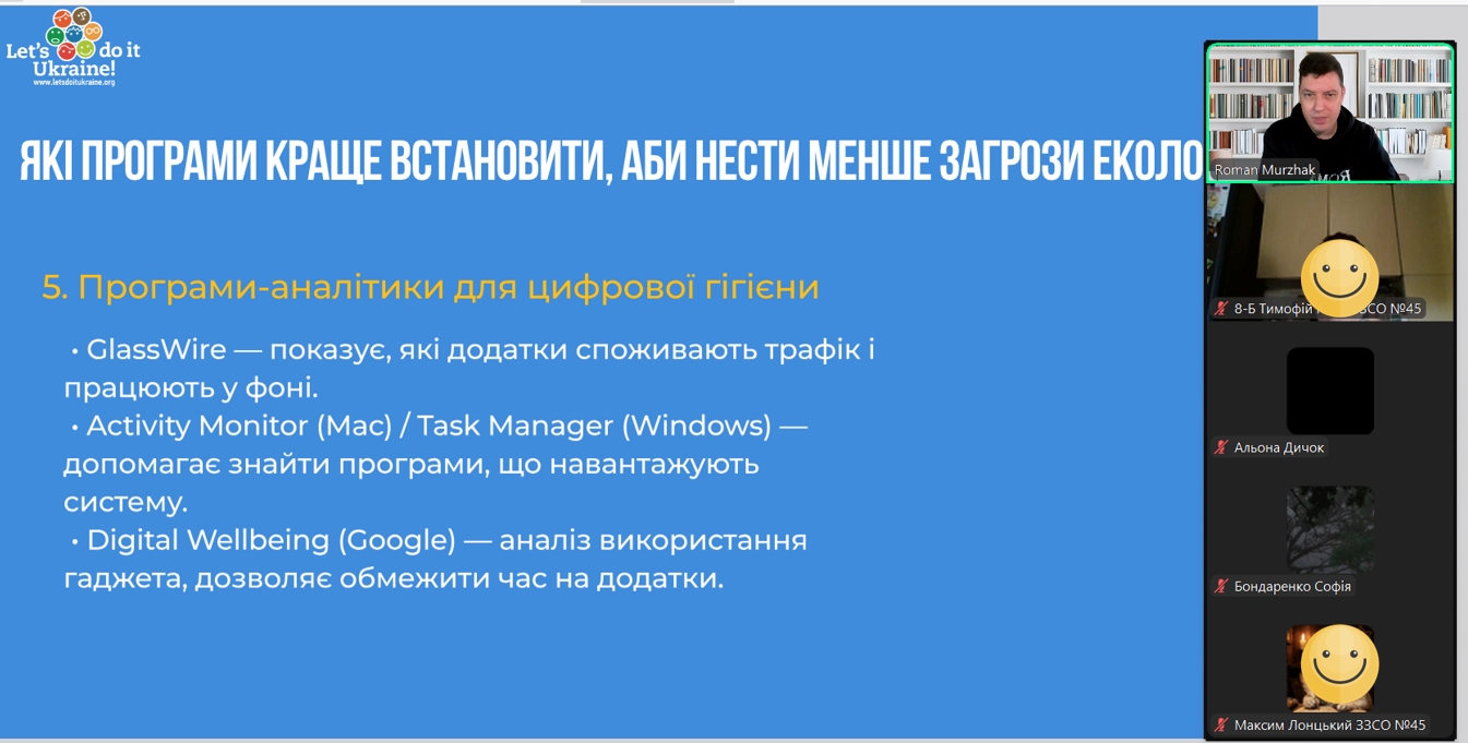 До Дня Землі ми знову згадали про цифрове прибирання. На заннях гуртків «Цифрова грамотність» вихованці разом із керівником Романом Муржаком вкотре наводили лад у смартфонах: видаляли зайві файли, зміцнювали захист та дізнавалися, як чистота пристроїв сприяє зменшенню загроз для довкілля. Порядок у пам’яті гаджета — це проста щоденна турбота про наш спільний дім. Дякуємо Let's do it Ukraine за корисні матеріали. Зробимо Україну чистою разом!