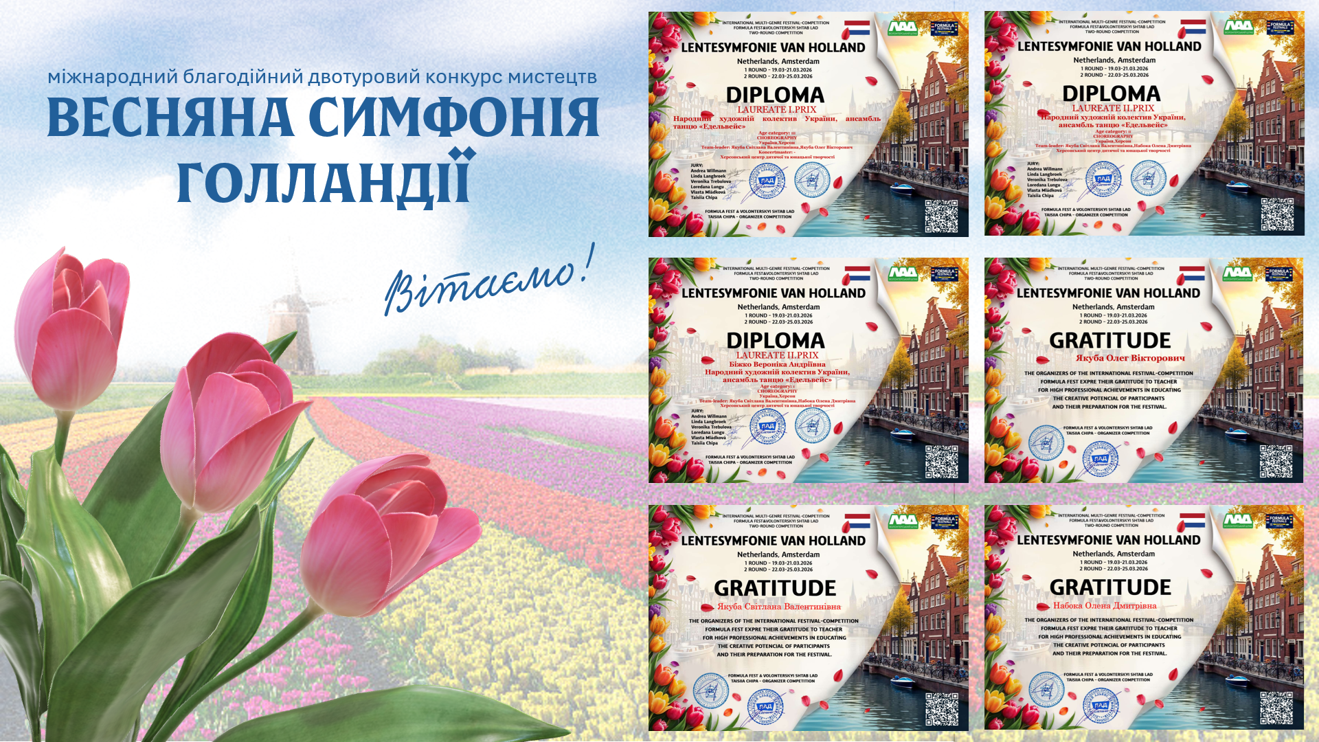 Одне перше та два других місця отримали виступи народного художнього колективу ансамблю танцю «Едельвейс» на Міжнародному благодійному двотуровому конкурсі мистецтв "Весняна симфонія Голландії". Подяками також відзначено керівників колективу: Світлану та Олега Якуб, Олену Набоку.